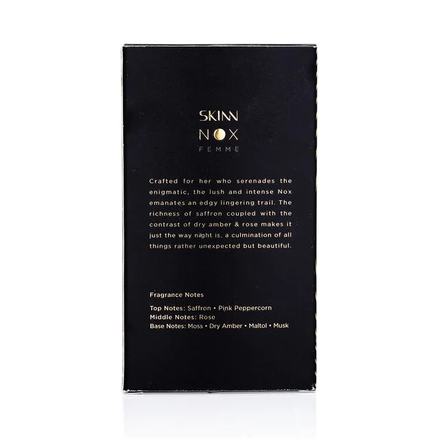 Crafted for her who serenades the enigmatic, the lush and intense Nox emanates an edgy lingering trail. The richness of saffron coupled with the contrast of dry amber & rose makes it just the way night is, a culmination of all things rather unexpected but beautiful.